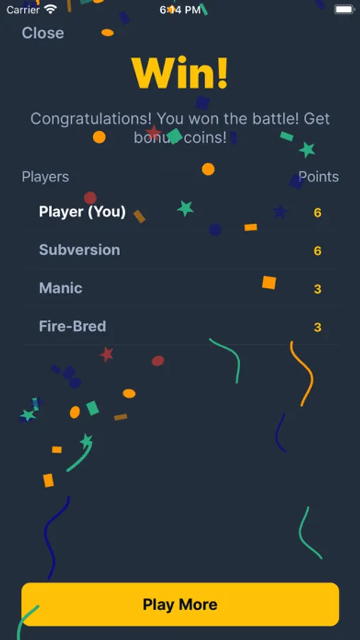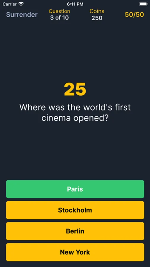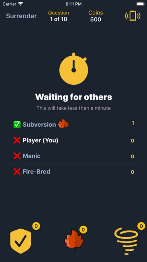 Players can participate in duels with random opponents. At the beginning of the game, users gather in the waiting room. After the start of the game, all participants are sequentially asked 10 questions. Each question has 4 possible answers, of which one is correct. Whoever answers the most questions correctly wins. The game has hints, you can also follow the progress of other players.