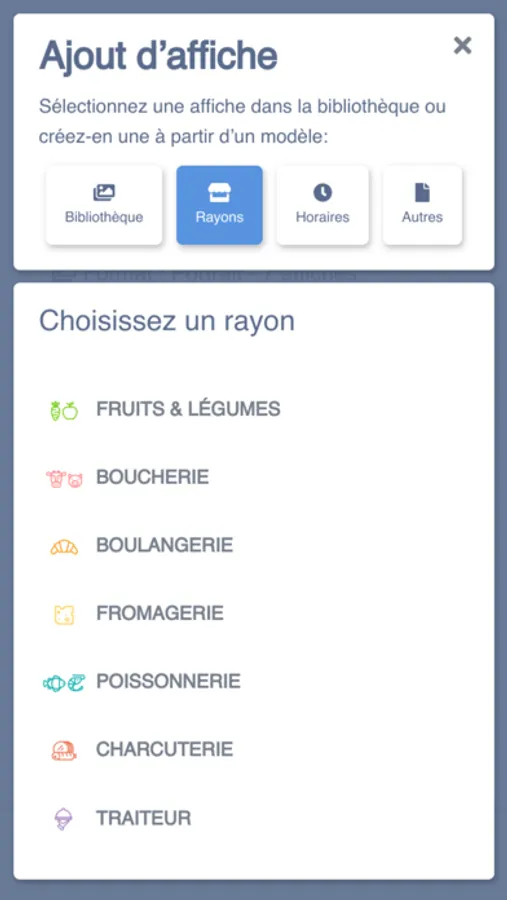 - Bibliothèque d'affiche: qui permet de voir toutes les affiches disponibles pour votre magasin