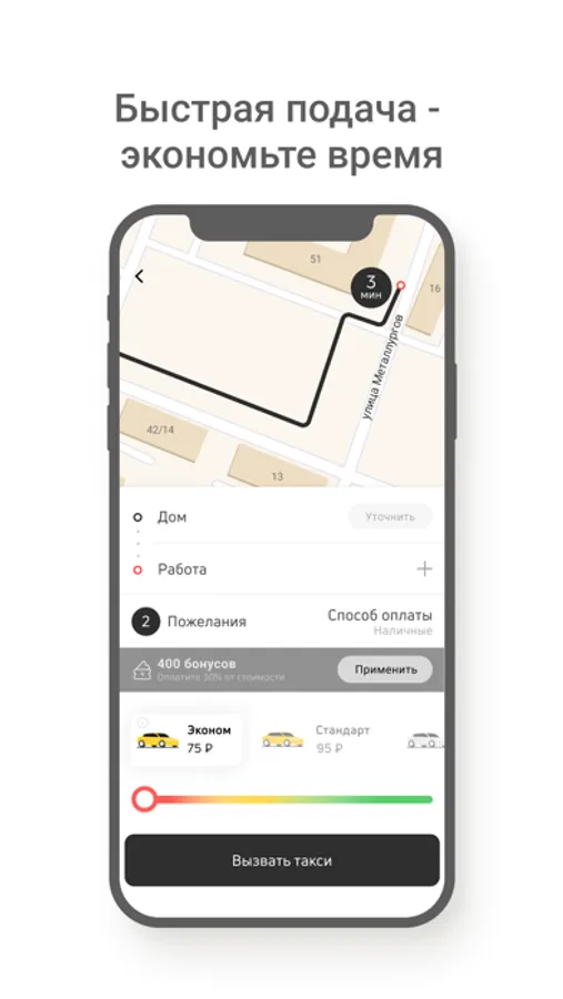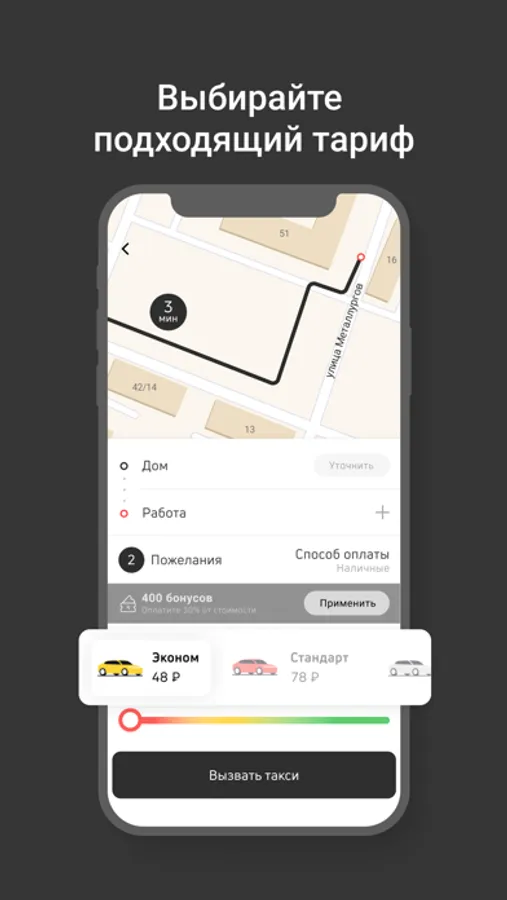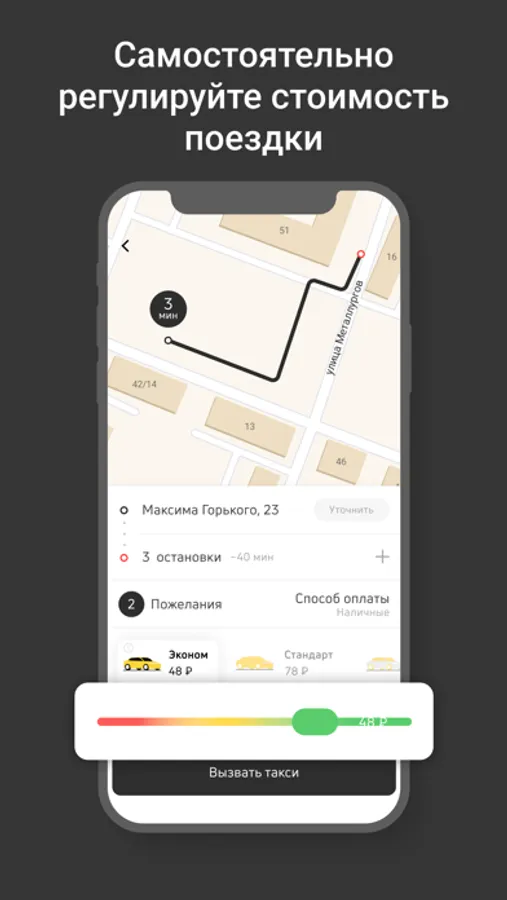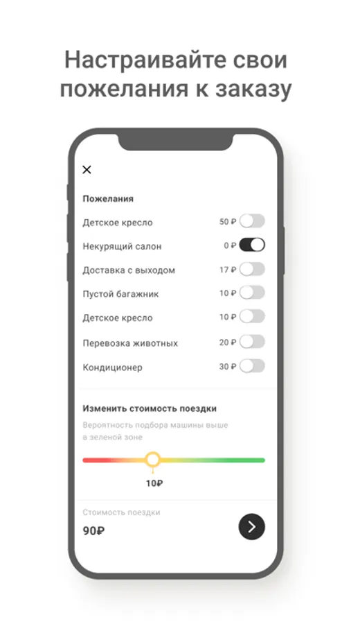 С помощью удобного ползунка вы можете снижать цену поездки или поднять ее, если хотите ускорить поиск машины.