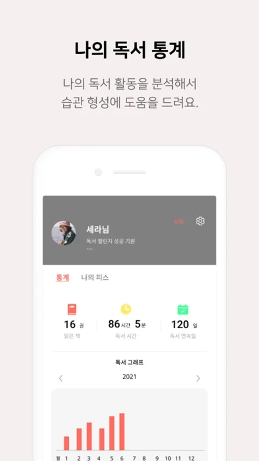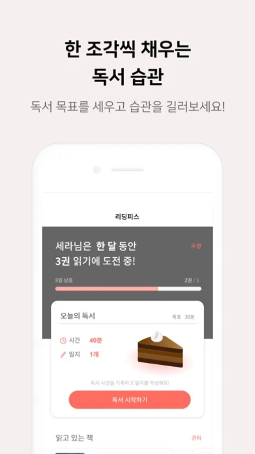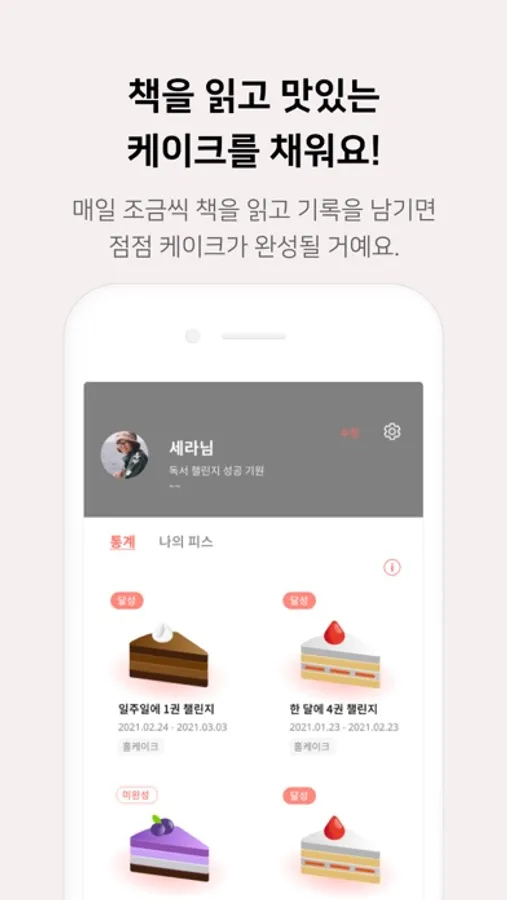 - MY 탭에서 독서 통계와 획득한 케이크 리워드를 볼 수 있습니다.