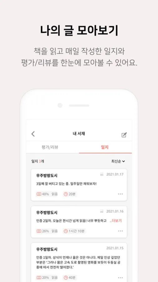 - 내 서재 탭에서 내가 쓴 평가와 일지를 조회할 수 있습니다.