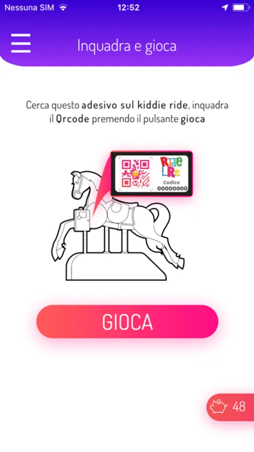 Con l’App RideRe, puoi divertirti sui nostri kiddie rides anche se hai dimenticato il portafogli a casa. In qualsiasi momento, in modo facile e sicuro, puoi caricare il tuo salvadanaio virtuale e utilizzare i crediti che servono per giocare coi kiddies identificati dal QR-code. E non solo. Con il tuo account, puoi regalare crediti ai membri della tua famiglia, ai parenti e agli amici, caricando il loro salvadanaio virtuale oppure ricevere i crediti da loro. L’operazione è davvero molto semplice!