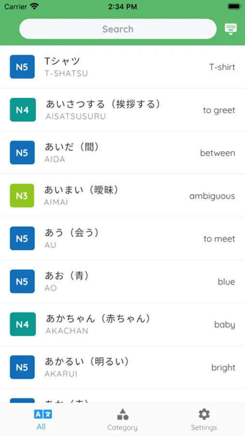 The word search can be done in kanji, hiragana, romaji, or English, making it easy for even beginner Japanese learners to look up words.