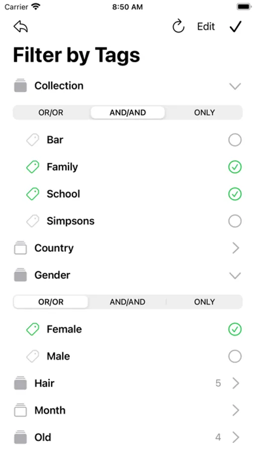 1) OR/OR: if 2 tags selected in one folder – will be displayed items with first tag + items with the second tag