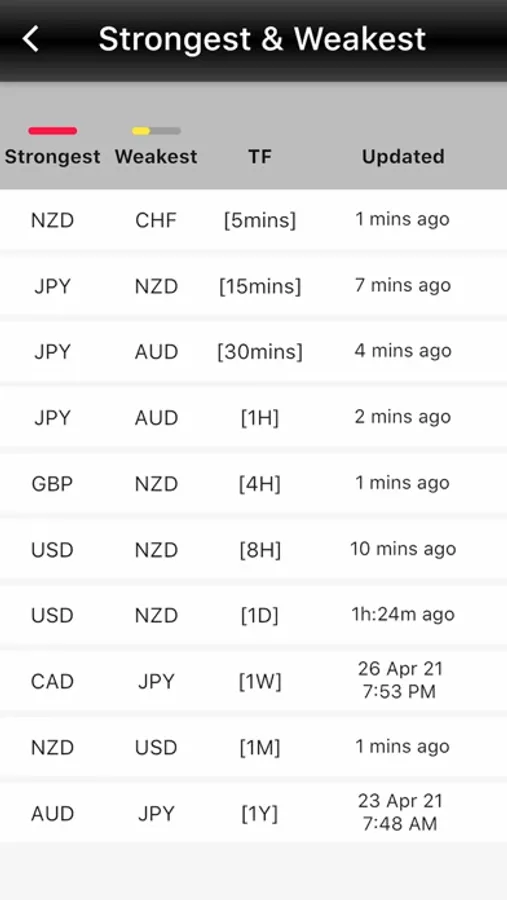 Receive instant notifications when the strength and weakness of certain currencies change. Alerts can be a vital tool to assist with timing when to enter and exit positions at the right time. Your alerts can be configured for specific currencies and preferred timeframes.