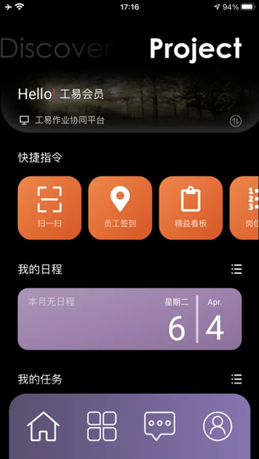 2、工易APP功能选择平台、我的任务、我的流程、我的作业、我的工作、工作查询、我的项目、我的日程、我的数据等九大功能。