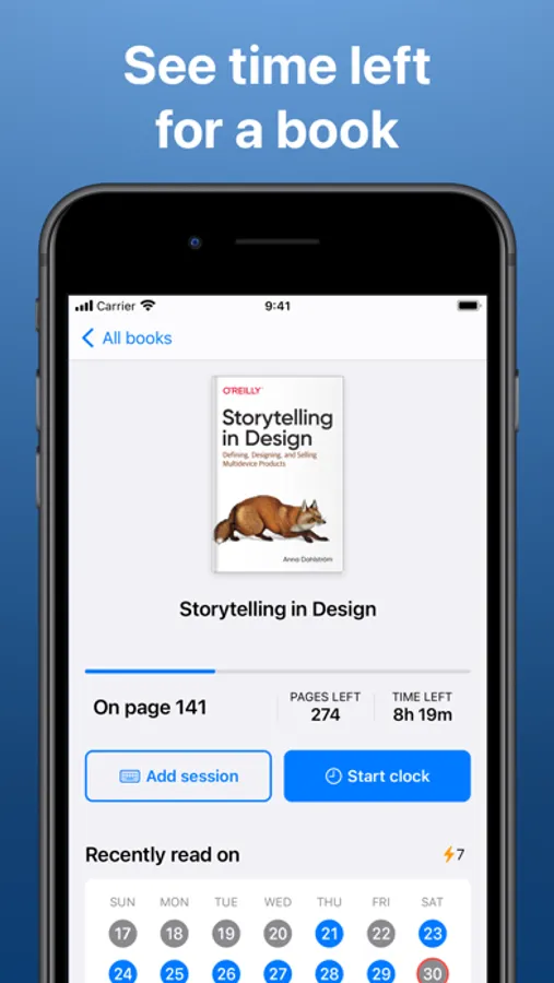 Log your reading sessions to know how long until you're done with a book.