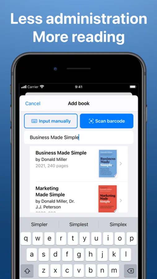 Scan the books' barcode or use a search field to retrieve info from Google Books. Or just enter everything yourself.