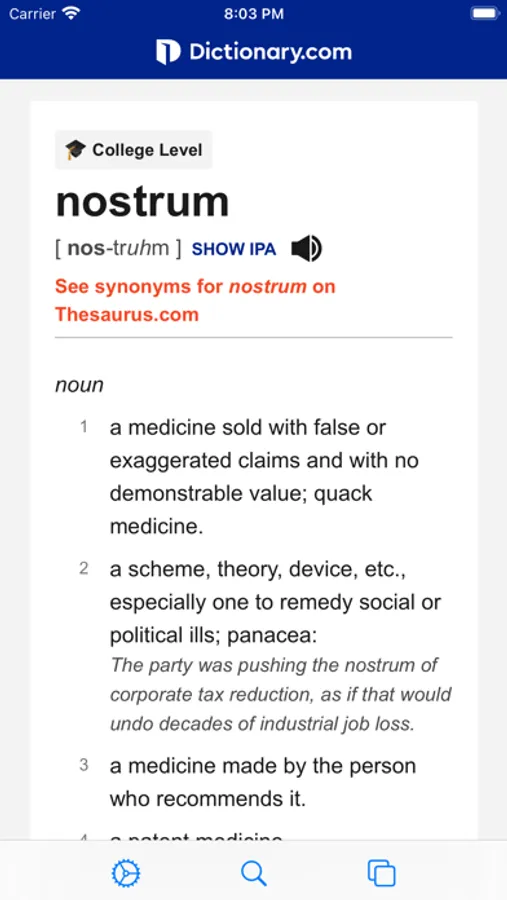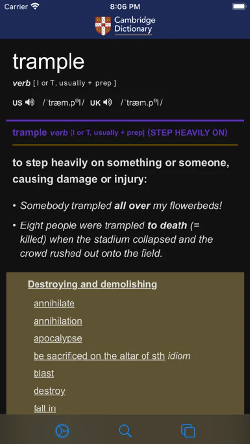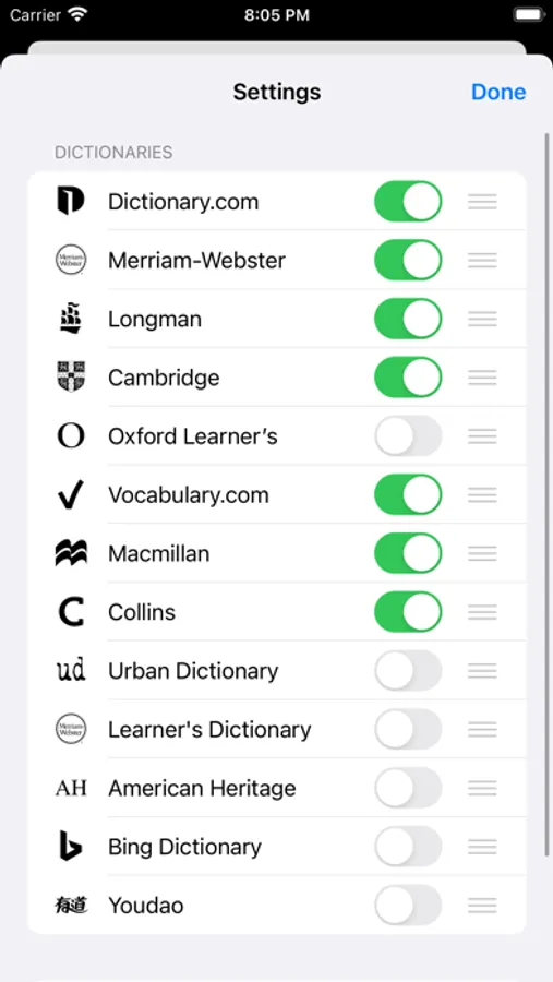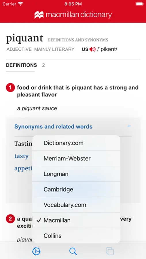 Swipe left or right to switch different dictionaries. These online free dictionaries are included: Dictionary.com, Longman, Webster's, Collins, Urban Dictionary, Vocabulary.com, Oxford Learner's Dictionaries, Bing Dictionary, etc.