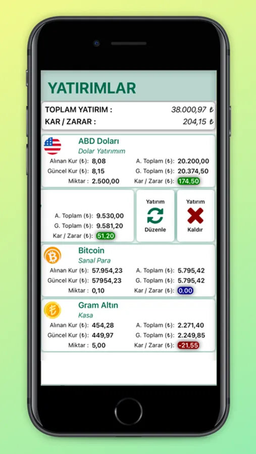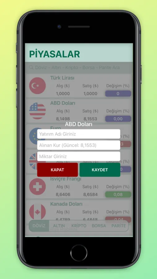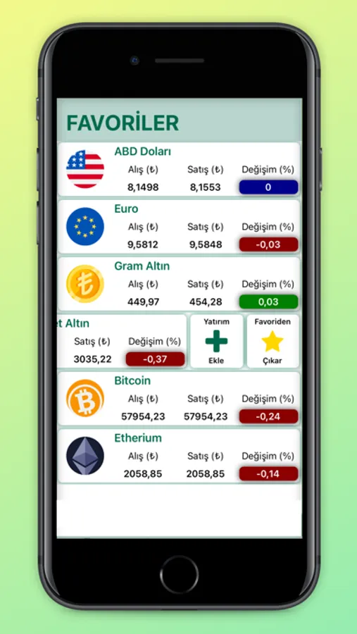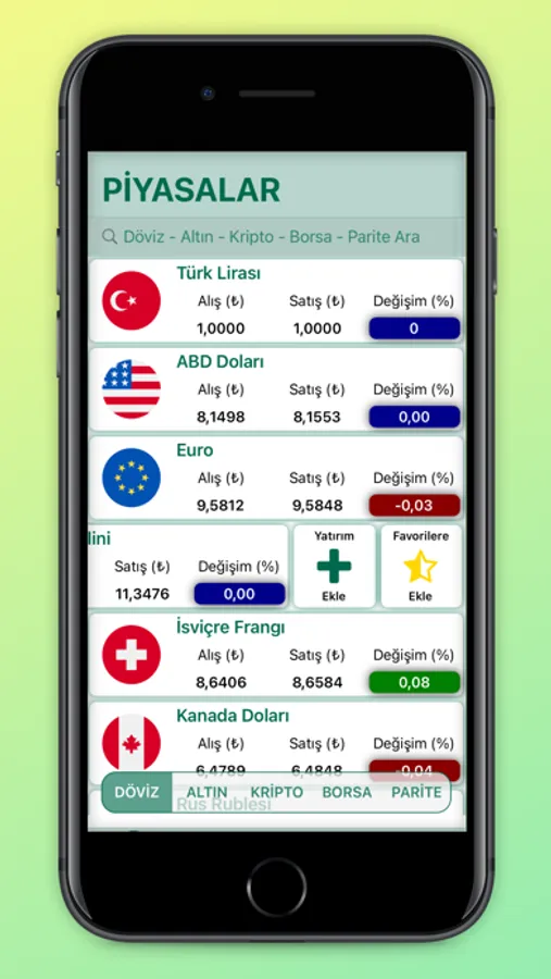 ForWall Döviz, Altın ve Parite gibi birimleri listeler. İstediğiniz birimi favoriye alarak daha kolay takip etmenizi sağlar. Yatırım yaptığınız birimde miktar girerek güncel kurlardan TL cinsinde karşılığını hesaplar size gösterir.