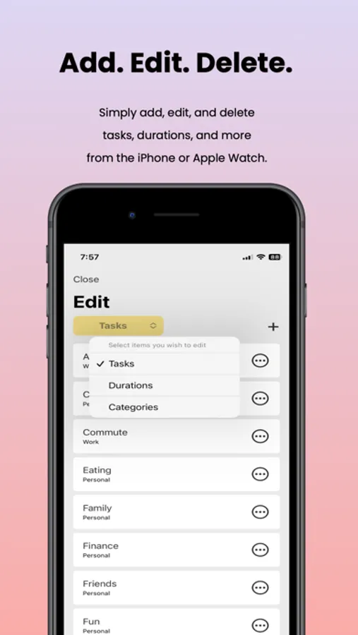 - Simple add, edit and delete tasks, durations, and more from the iPhone or Apple Watch.