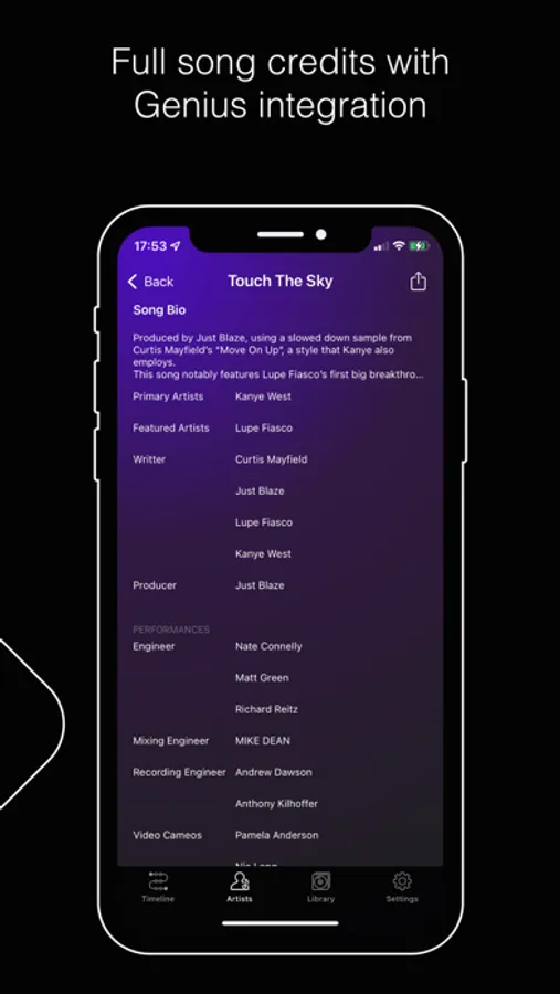 Using the Genius integration*, MusicHub provides you with full song credits, including producers, writers, mixing engineers as well as song bio, samples, sampled by and links to music and videos.