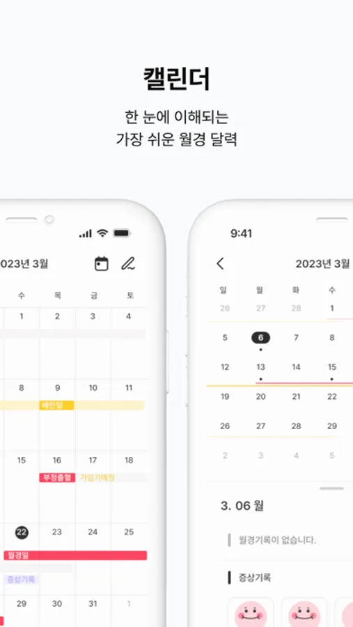 월경기, 배란기, 가임기, 증상을 캘린더에서 한눈에 이해할 수 있어요.