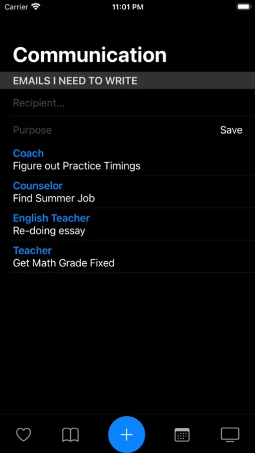 This app is a tool for students to manage their heavy workloads by allowing them to keep track of their exercise plans, assignments, exams, emails, and chores through a to-do list.