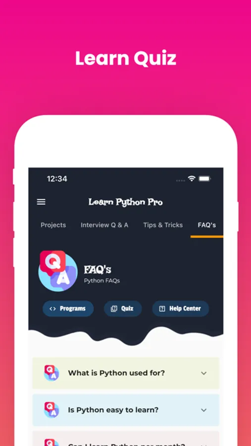 Learn Python is a must have app for all coding learners or computer science students to learn python programming language whenever they want and wherever they want. Whether you’re preparing for a python interview or any exam that requires python programming knowledge, you can find amazing content on this programming learning app.