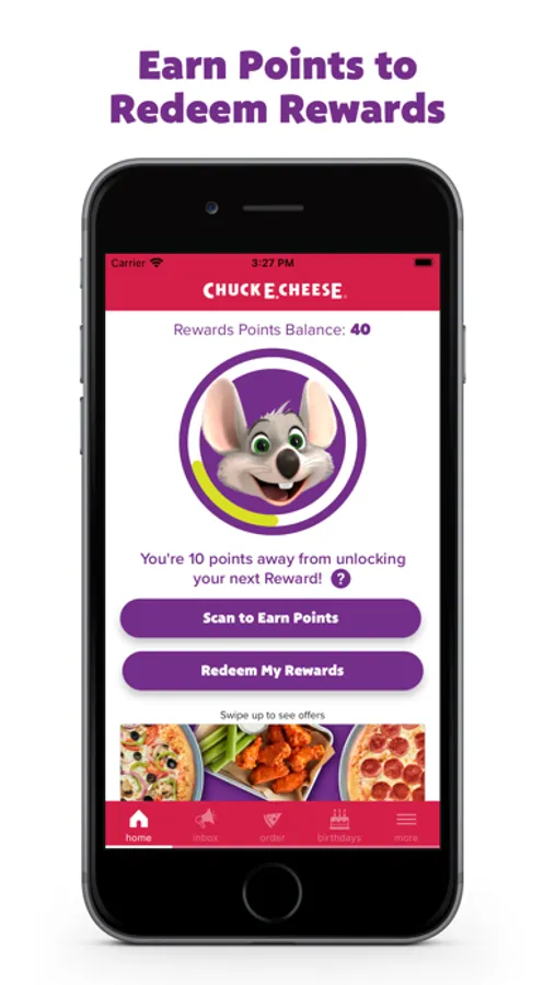 • Join Chuck E. Cheese Rewards to get special offers, unlock exciting prizes and more. You’ll earn Rewards Points for every dollar you spend, and even get special birthday treats for you and your family!