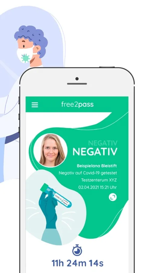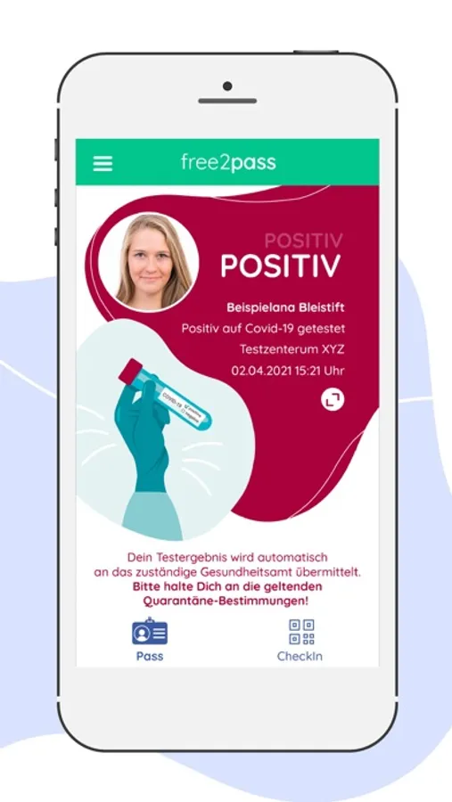 free2pass trifft keine Diagnosen oder medizinische Entscheidungen, sondern ruft ausschließlich die von einem offiziellen Testzentrum ausgegebenen Ergebnisse ab. free2pass dient nicht als Ersatz für medizinische Leistungen und dient ausschließlich der Ausweisung mit einem zuvor medizinisch ausgewertetem Testergebnis.