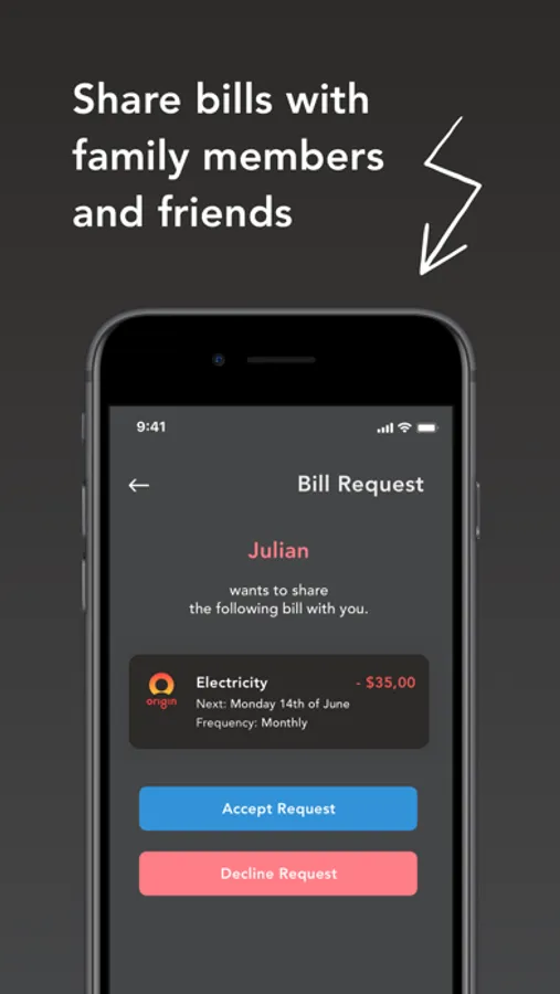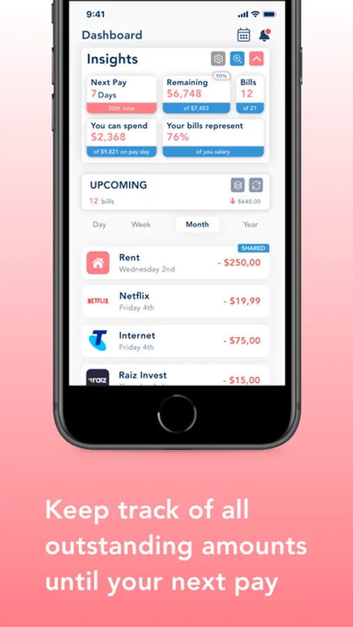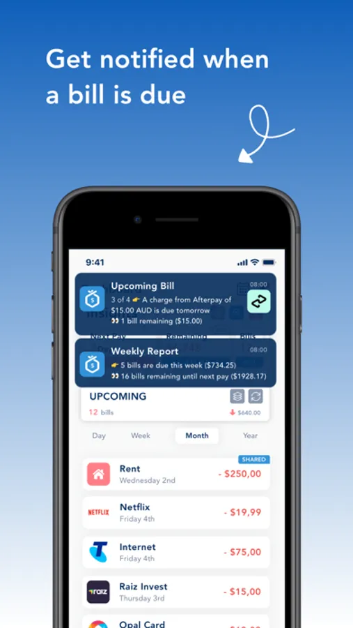 Have common bills with your flatmates or family? Create a shared bill so everyone is notified on time. Amounts can be personalised as well.