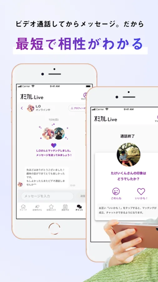 婚活・再婚活のためのマッチングアプリ「オミカレLive」は、気が合うパートナーに出会えるように、最初にビデオ通話から相手の雰囲気を知ることができるマッチングアプリです。
