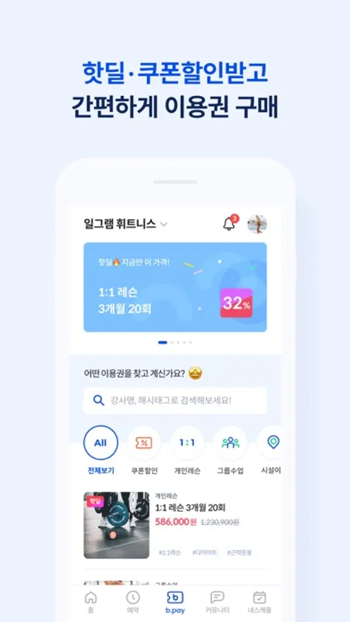 [PT, 필라테스, GX, 골프, 스포츠, 1:1 트레이닝 등 언제 어디서나 모바일에서 손쉬운 원터치 예약]