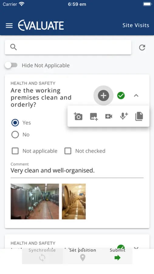 As part of the Evaluate platform for easier sustainability evaluation, Site Visits lets you document your site inspections/audits or more informal facility (e.g. supplier) visits using predefined checklists, both standardised and customised to your needs.