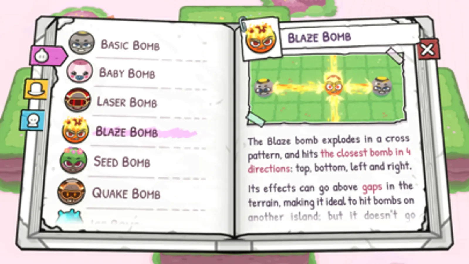 Meet the Laser bomb, the Black Hole bomb, the Magma bomb, the Smoke bomb and many more, each with their own effect and range. Being a bomb expert is no easy task... But the Nitronomicon will always be at hand to remind you what they all do. Years of bomb research are compiled in this book, so keep it close!