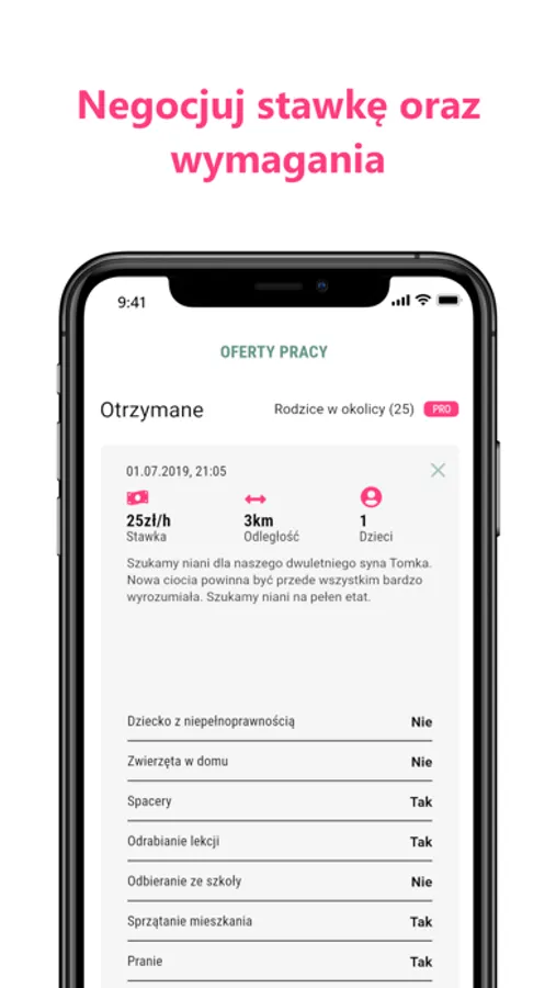 Our application is distinguished by the fact that you will find only active profiles of babysitters. A nanny who does not respond to a job offer within three days - disappears from our list. We also make sure to display you checked profiles, babysitters from the nearest neighborhood, which shortens the time of searching as much as possible.