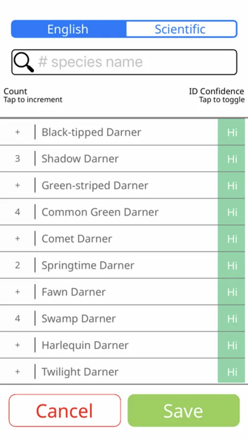 - Easily toggle between display of English and Scientific names.