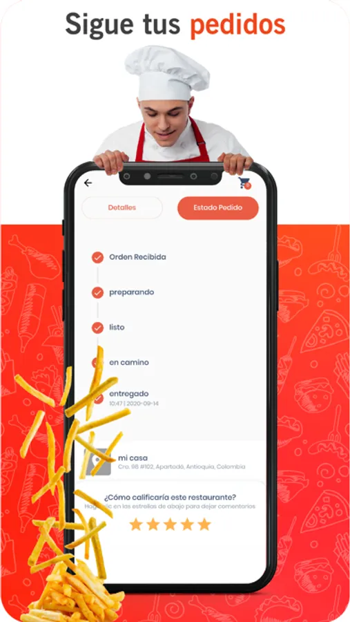 Cuando hagas tu pedido, verás la dirección, la hora estimada de entrega, el precio total con los impuestos y el Costo de envío incluidos. Puedes pagar a contra entrega o realizar una transferencia. Sigue tu pedido en tiempo real del restaurante a tu mesa.