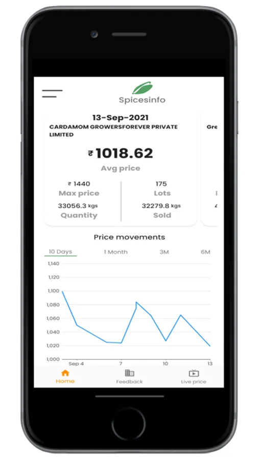 Spices info is a tracker for cardamom auctions that happen in the southern part of India. The app lists the daily auction details like Avg price, Max price, quantity, etc, It also provides graphs to show the price trends.