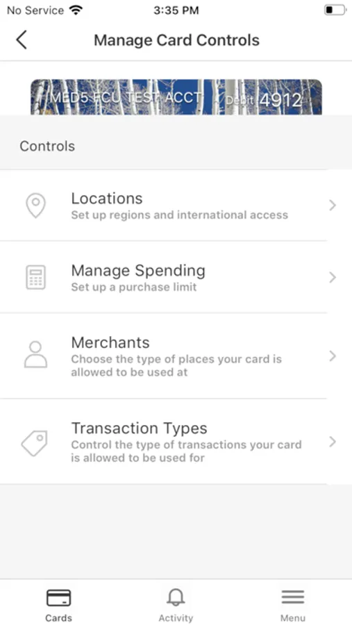 Spending limits can be established to allow transactions up to a certain dollar value and decline transactions when amounts exceed your defined thresholds. Transactions can be monitored and managed for specific merchant categories such as gas stations, department stores, restaurants entertainment, travel, and groceries. And your transactions can also be monitored for specific transaction types: in-store purchases, e-commerce transactions, mail/phone orders and ATM transactions.