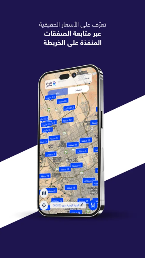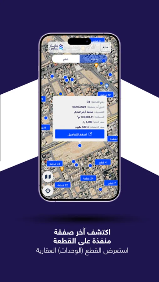 تطبيق عقارساس يقدم خدمة البحث بالخريطة عن القطع والصفقات العقارية المنفذة (الإفراغات) في مدينة الرياض