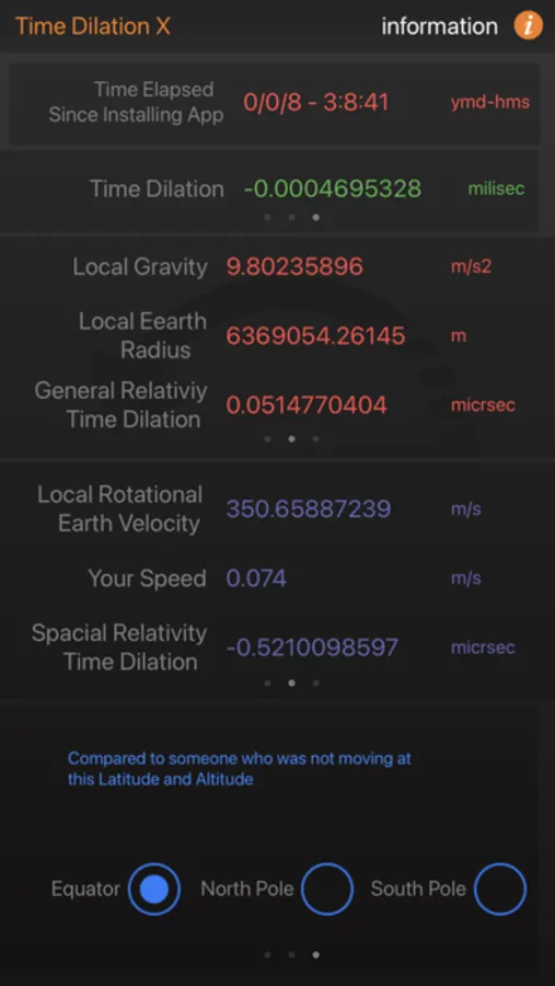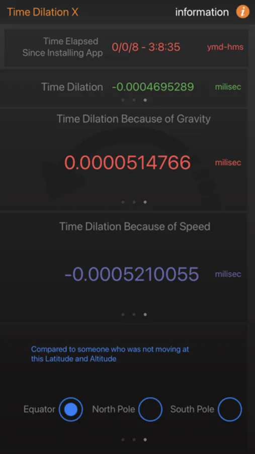 TimeDilationX app is calculating time dilation according to Einstein's Theory of Special Relativity, and General relativity equations depend on your GPS location. Compared the time dilation three different locations such as equator, north and south pole. And elapsed time is starting from installation app time and also cumulative time dilation as 10 years has been calculated and shown.
