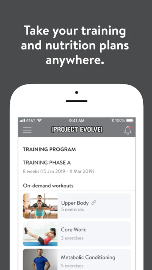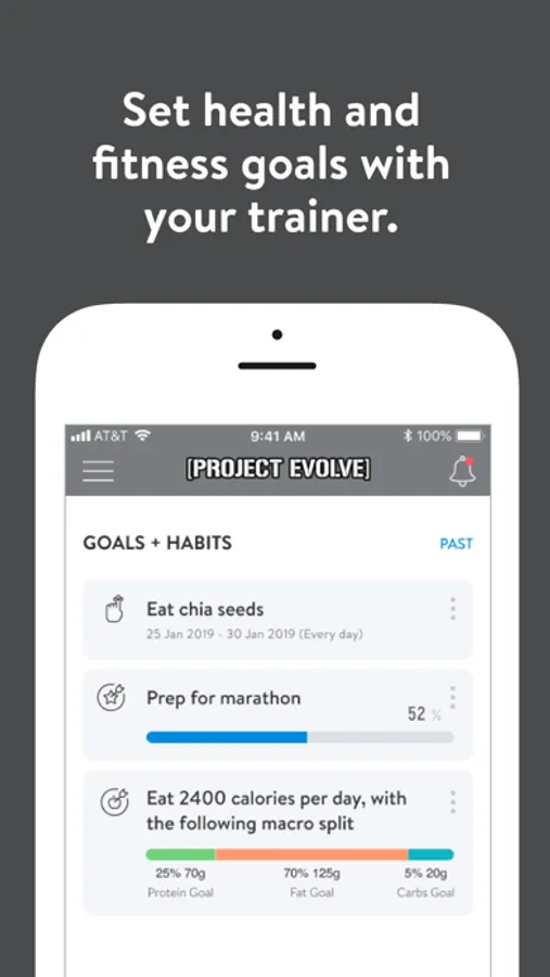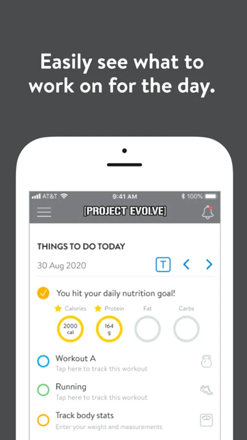 With the Project Evolve App, you can start tracking your workouts and meals, measuring results, and achieving your fitness goals, all with the help of your coach.