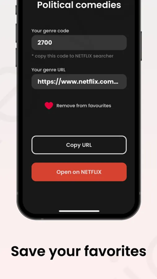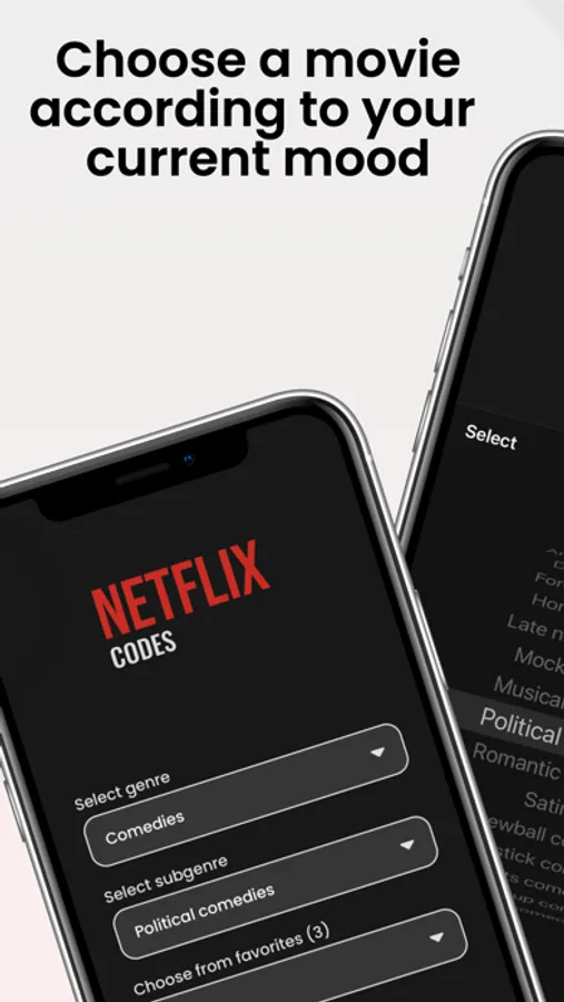 With this application you can effectively filter and display movies and serials on Netflix. Choose a movie according to your current mood from hundreds of genres. Save your favourites, get movie code and open it on Netflix.