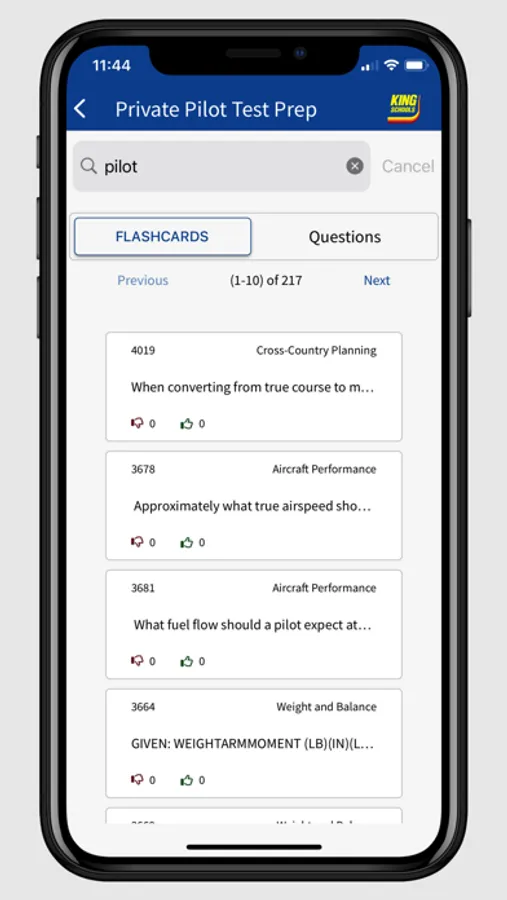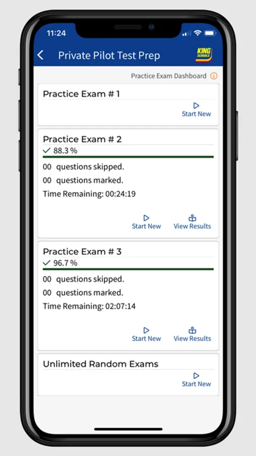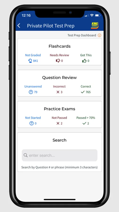 The KING Test Prep Companion App is part of the King VIP Study Method to get a guaranteed high score on your FAA Knowledge Test. It works with the question database of your Ground School and Test Prep course and allows you to study FAA style questions, flash cards and unlimited Practice Exams -- anywhere, anytime. Even when not connected to the Internet! Your question review progress will automatically sync to our online servers the next time your device is connected to the internet.