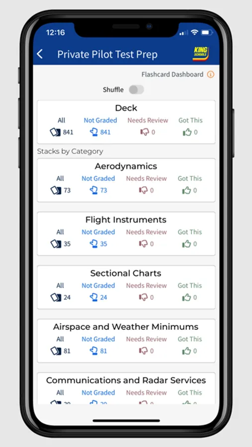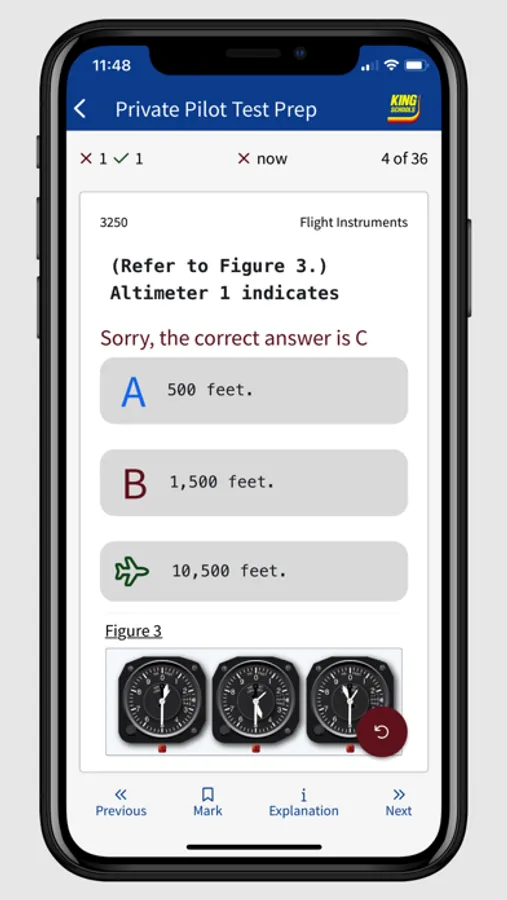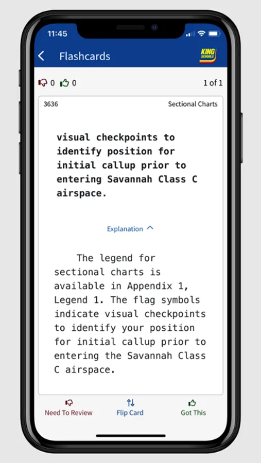 Flashcards will give you "Decks" of questions by category such as Aerodynamics, Flight Instruments, Sectional Charts, etc. You can choose to shuffle the entire set of decks, or study just one category/deck. You will read the question on the front of the card, then "flip" the card to see the answer side. You can then choose to mark each card "Got This," or "Needs Review" so you can continue to focus on areas that need more work. Clicking the down arrow next to "Explanation" will provide in depth knowledge to help retain valuable information. Use a pinch zoom for any figures to get a closer look!