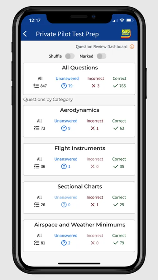 Question Review will present All Questions of your FAA Test Prep course, also broken out by study category or all questions together. Be sure to "Mark" questions you want to review later, which you can toggle viewing only "Marked" questions at the top. You can also view only questions answered incorrectly to focus on troublesome topics.