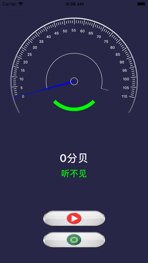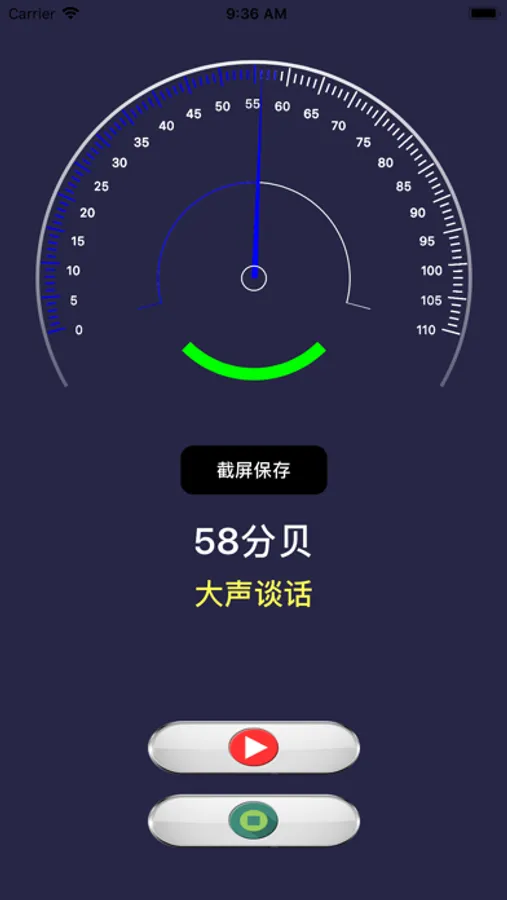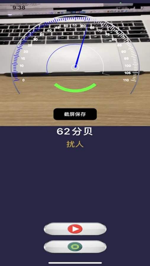 1.打开应用,点击红色“开始”按钮即可开启声音采集,检测,实时显示当前的声音分贝数。