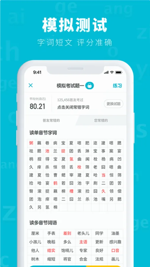 普通话测试APP功能,纠正发音巩固练习,提高普通话学习效率。