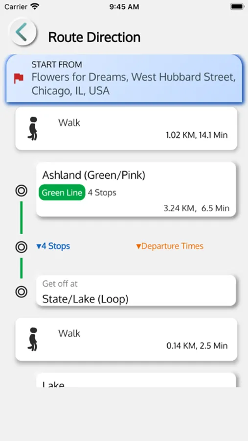 •Click on your preferred route and get all granular details like minimum walking distance to the nearest transport to pick up point and after drop point to your destination to make it your Chicago travel app complete.