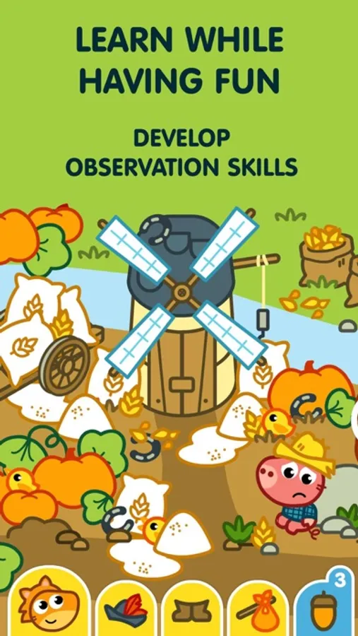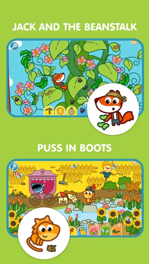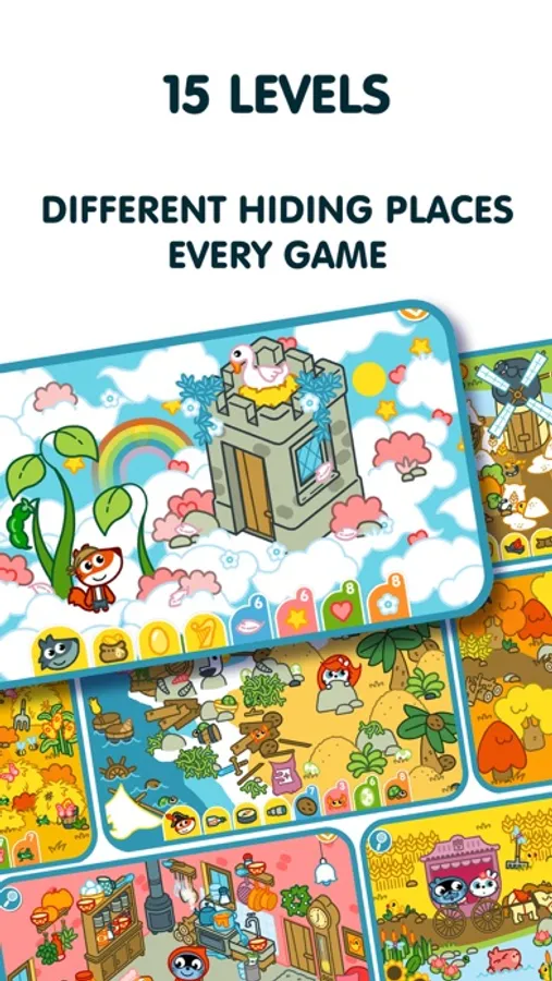 Seek and find characters and objects to advance the story across 15 pictures. Behind rocks, under tables, in trees... there are lots of places to hide! Explore and search the pictures with your fingers. Open, lift, clear... If you can't find something, use the magnifying glass for help.