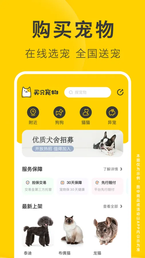 买只宠物app作为一款在线宠物交易平台,汇集全国众多猫舍犬舍宠物商家入驻,交易资金第三方托管,提供售后10天保障服务,保障交易安全。
