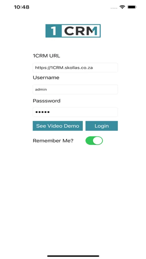 Just enter the web URL for your own 1CRM system (remember the https:// prefix), plus your normal system username and password, and click on Login. It’s also really handy if you want to enable the toggle switch for Remember Me – then your URL, username and password will always be there the next time you need to login.