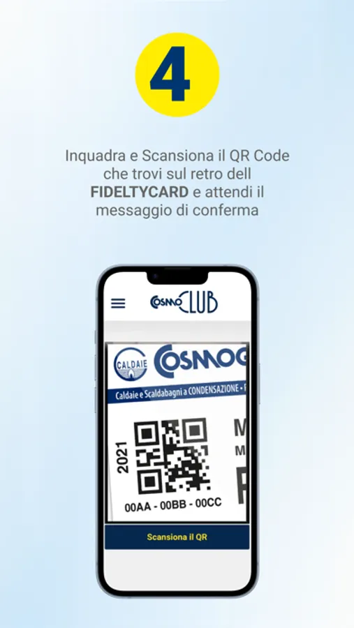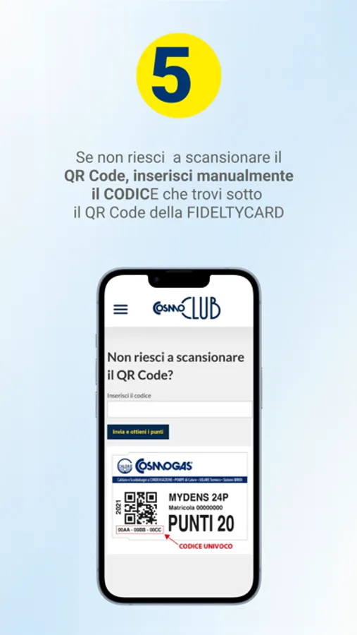 Facile, basterà utilizzare le Fidelity Card presenti sui prodotti Cosmogas. Potrete scansionare i QR Code oppure inserire manualmente il codice presente sotto di esso. Una volta che l'operazione sarà andata a buon fine vi apparirà un messaggio di conferma ed è fatta… i punti sono vostri!