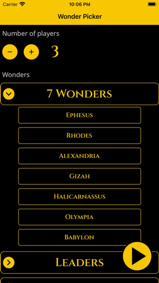 Wonder Picker is an app to accompany the board game 7 Wonders. The app helps you with setting up the game by randomly choosing a wonder and a tableau side for every player. In addition to that the app also lets you randomize the seat order around your gaming table to give everyone the same preconditions.