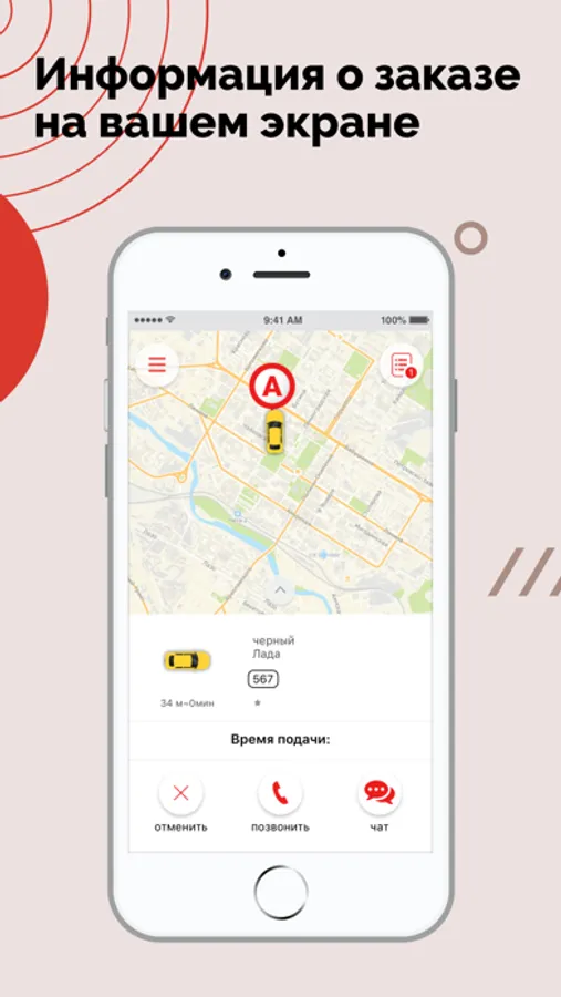 Ты всегда видишь на экране полную информацию о заказе: время подачи, марка, цвет и номер машины, имя водителя.