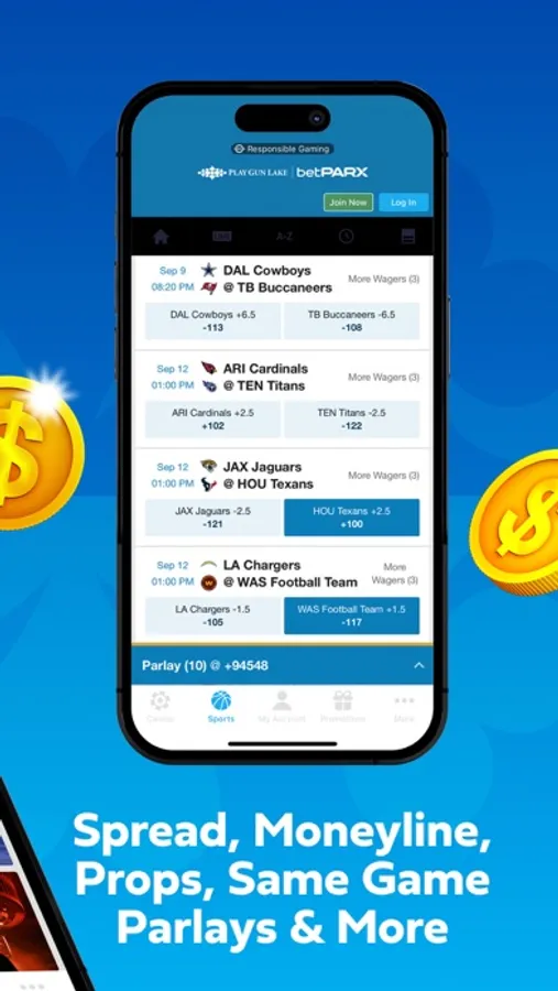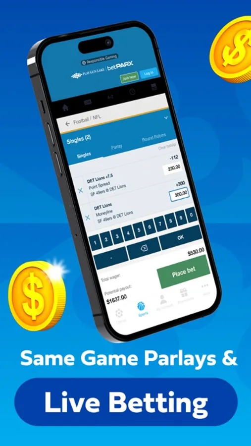 Bet Over-Unders, Parlays & Same Game Parlays, Futures, Live, or Spread Bets on the Sportsbook.