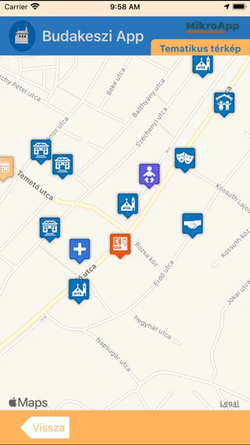 Az applikációból elérhető a város összes intézménye, kapcsolati adatokkal, és térképi elhelyezkedéssel.