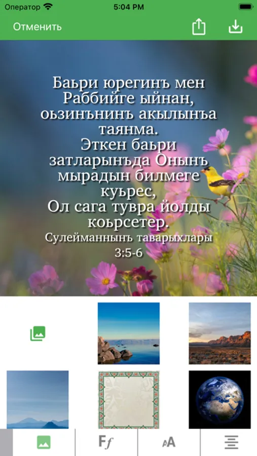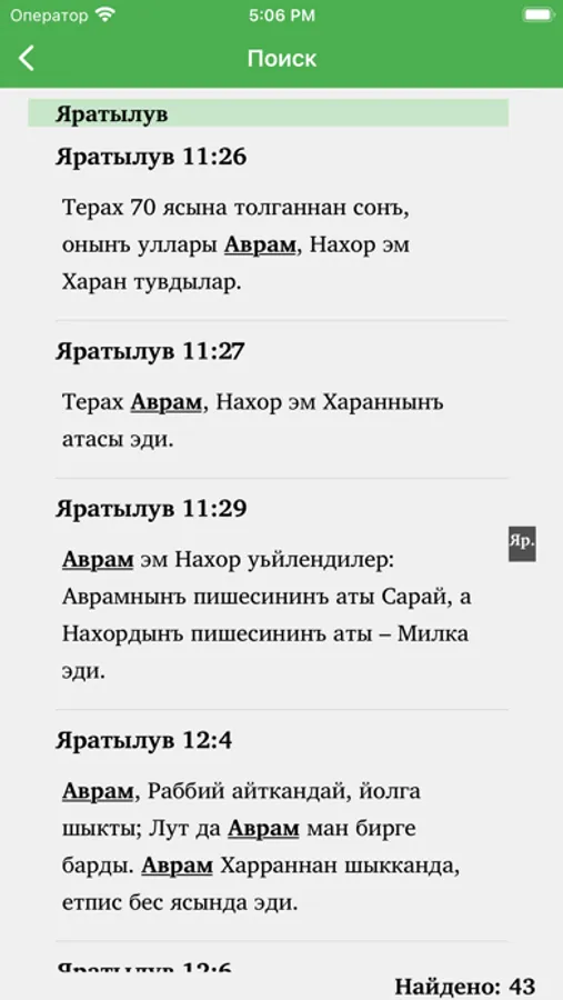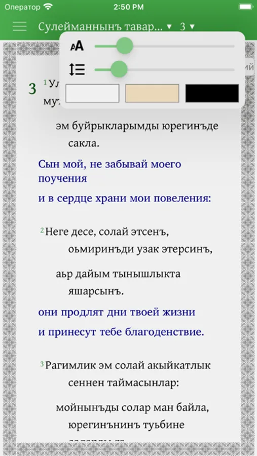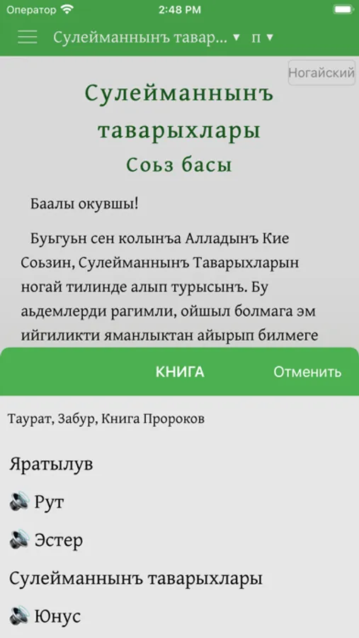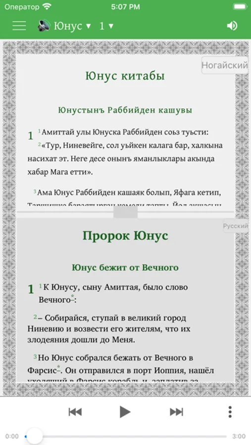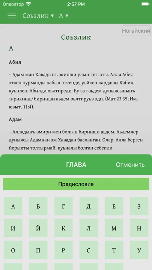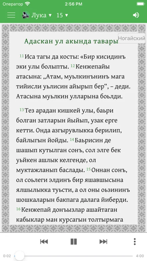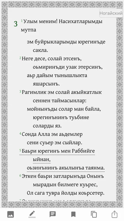 This application provides the opportunity to study the Scriptures. It contains the translation into Nogai itself, as well as a Russian translation. These translations can be displayed side by side on demand. Users can highlight verses in different colors, place bookmarks, write notes and view the reading history.